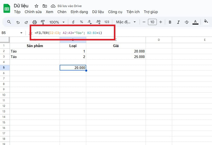 =FILTER(C2:C3, A2:A3=”Táo”, B2:B3=1)