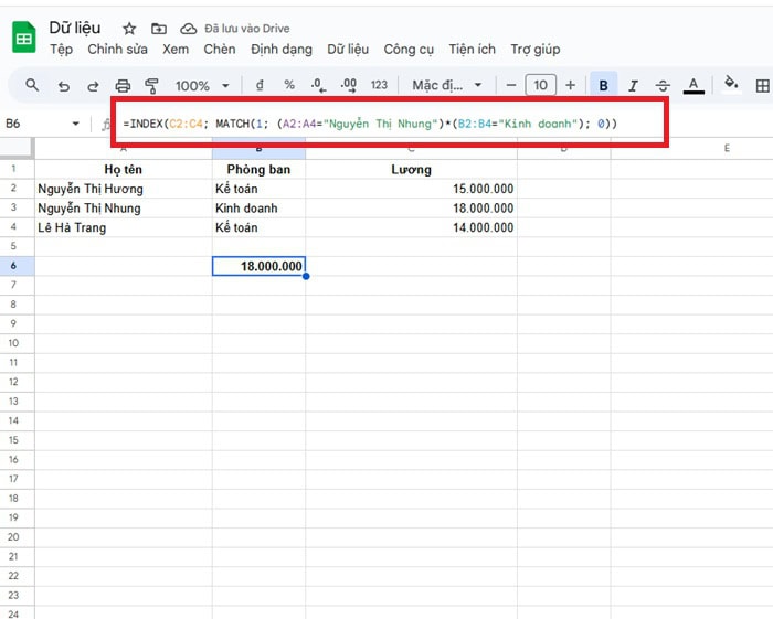 =INDEX(C2:C4; MATCH(1; (A2:A4=”Nguyễn Thị Nhung”)*(B2:B4=”Kinh doanh”); 0))