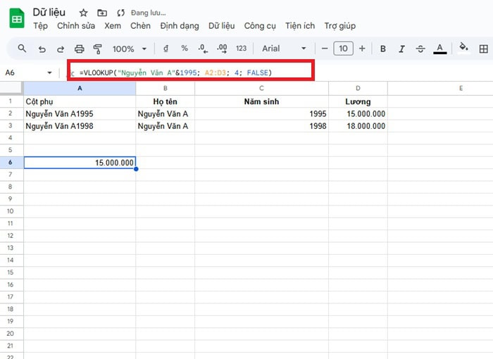=VLOOKUP(“Nguyễn Văn A”&1995; A2:D3; 4; FALSE)