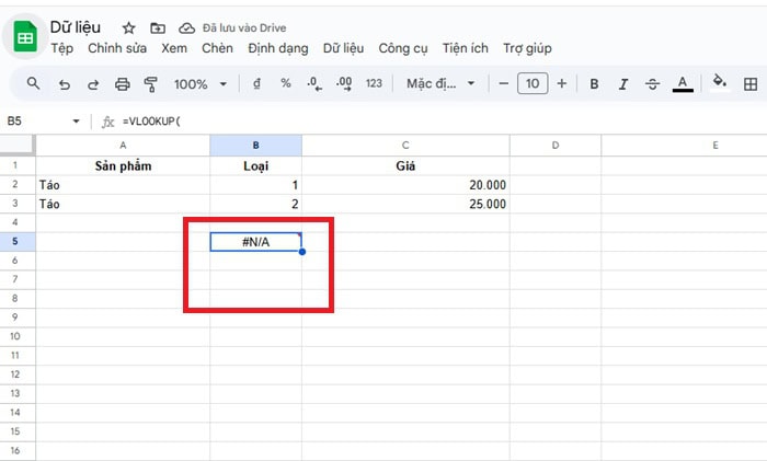 Lỗi #N/A là lỗi xuất hiện thường xuyên nhất khi sử dụng hàm VLOOKUP nhiều điều kiện. Lỗi này có nghĩa là Google Sheets không tìm thấy bất kỳ dòng dữ liệu nào khớp với giá trị tra cứu.