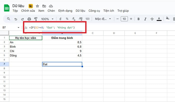 - Nếu điều kiện sai (điểm nhỏ hơn 8), hàm IF trả về giá trị “Không đạt”