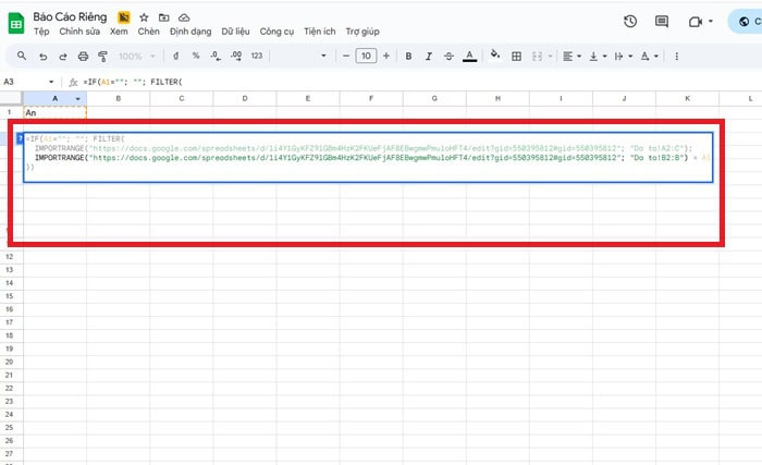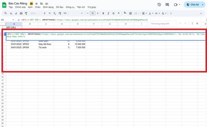 - Sau khi dữ liệu hiển thị thành công, bạn mới lồng IMPORTRANGE vào hàm IF.