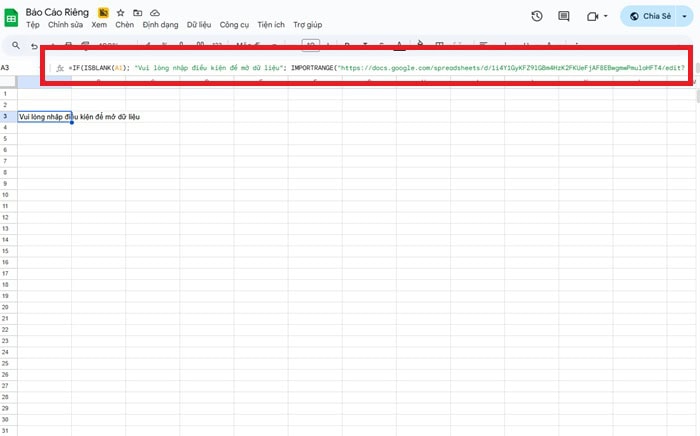=IF(ISBLANK(A1); “Vui lòng nhập điều kiện để mở dữ liệu”; IMPORTRANGE(“https://docs.google.com/spreadsheets/d/1i4Y1GyKFZ9lGBm4HzK2FKUeFjAF8EBwgmwPmuloHFT4/edit?gid=550395812#gid=550395812”; “Da ta!A1:E3”))