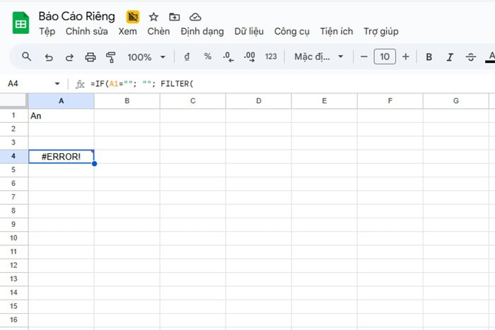 Lỗi #ERROR (Formula parse error) xảy ra khi Google Sheets không thể đọc được công thức. Nguyên nhân chính gây ra lỗi #ERROR khi kết hợp hàm IMPORTRANGE với hàm IF là do: