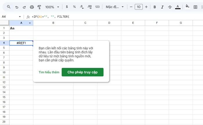 - Khi nhập công thức lần đầu, Google Sheets sẽ yêu cầu bạn nhấn Allow access (Cho phép truy cập) để cấp quyền kết nối dữ liệu