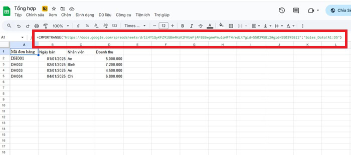 *Ví dụ minh họa hàm IMPORTRANGE trong Google Sheets