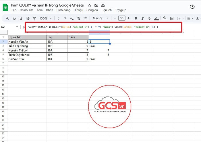 - QUERY(C2:C6; “select C”; 1): Truy vấn cột C (điểm số) từ bảng dữ liệu A1:C6. 1 là hàng tiêu đề.