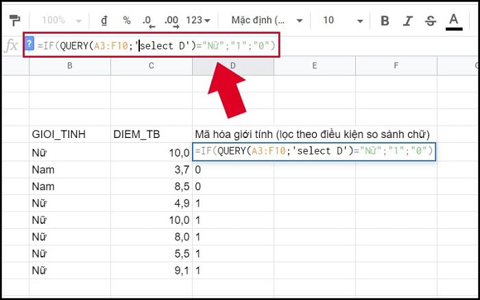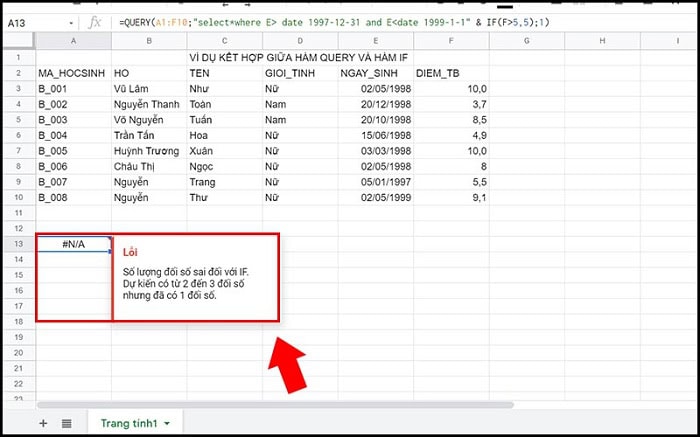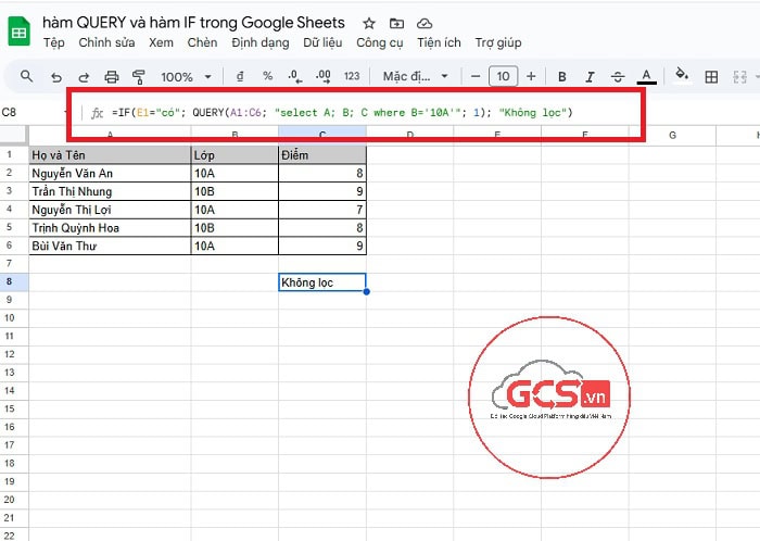 - QUERY(A1:C6; “select A, B, C where B=’10A'”; 1) : Nếu E1 = “có”, thì thực hiện truy vấn QUERY để lọc dữ liệu.
