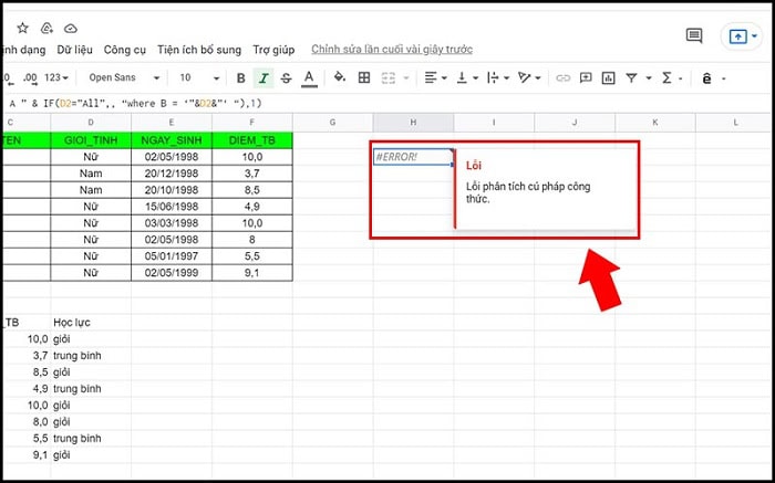 Lỗi #ERROR! là lỗi cú pháp chung nhất, thường xuất hiện khi bạn xây dựng chuỗi truy vấn không đúng quy tắc.