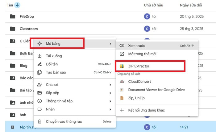 Phương pháp này giúp bạn mở và xem nội dung tệp ZIP trực tiếp trên Google Drive mà không cần tải tệp về máy. Tuy nhiên, trong một số trường hợp tệp nén quá lớn hoặc chứa nhiều thư mục lồng nhau, việc giải nén có thể bị hạn chế.