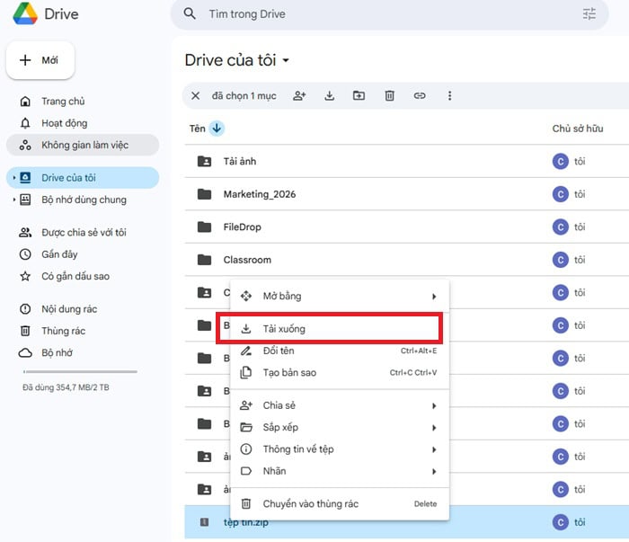 – Bước 2: Tải tệp nén từ Google Drive về máy tính bằng cách nhấp chuột phải vào tệp và Tải xuống.