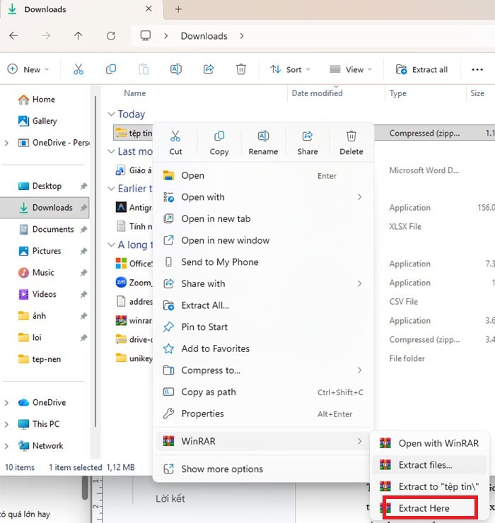 Bạn chỉ cần nhấp chuột phải vào tệp RAR và chọn Extract Here để tiến hành giải nén.
