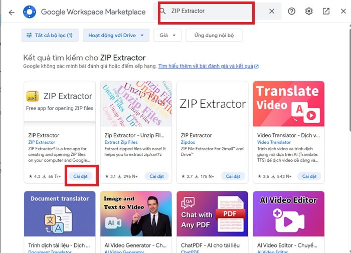 Trong cửa sổ tìm kiếm ứng dụng, bạn nhập từ khóa ZIP Extractor và tiến hành Cài đặt tiện ích này vào tài khoản Google Drive.