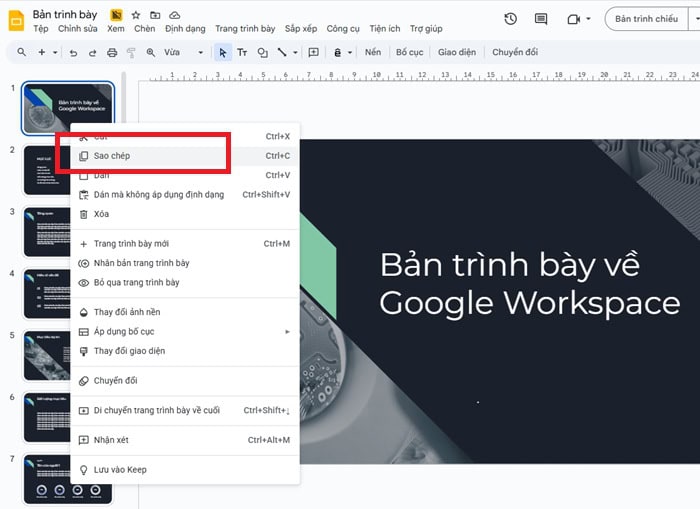 – Bước 1:  Đầu tiên, bạn cần mở file Google Slides của bạn. Ở cột danh sách slide bên trái, nhấp chuột chọn slide muốn chèn vào Google Docs.