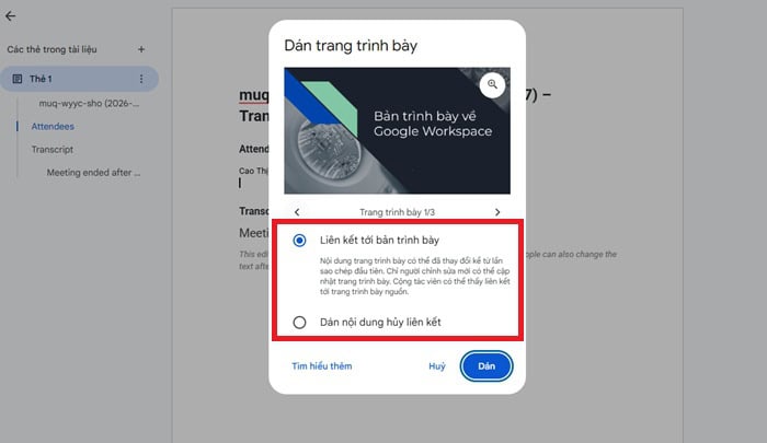 Khi sao chép slide từ Google Slides và dán vào Google Docs, hệ thống sẽ hỏi bạn muốn dán theo dạng liên kết hay không liên kết. Nếu mục tiêu của bạn là nhúng slide để nội dung có thể cập nhật về sau, hãy chọn Link to presentation. Việc chọn nhầm Paste unlinked sẽ khiến slide trở thành hình ảnh tĩnh và bạn phải thao tác lại từ đầu nếu muốn đồng bộ nội dung.