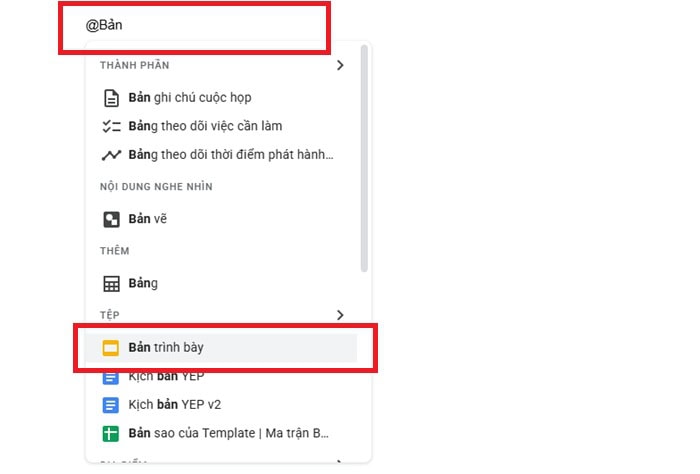 – Bước 2: Gõ ký tự @, sau đó nhập tên file Google Slides. Google Docs sẽ tự động hiển thị danh sách các file phù hợp trong Google Drive của bạn.