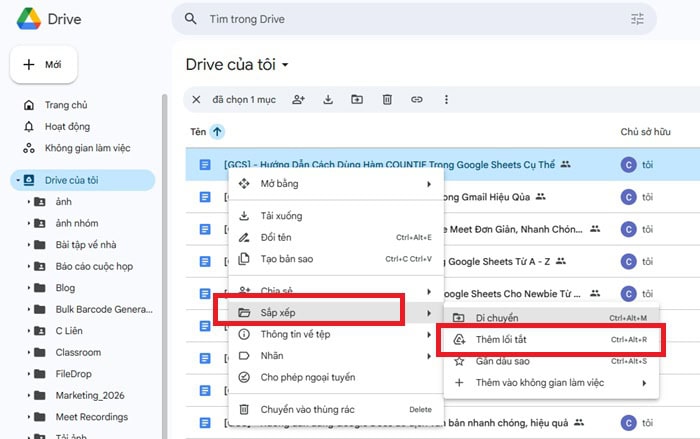 Nhấp chuột vào file >> chọn Sắp xếp >> chọn Thêm lối tắt vào Drive >> chọn thư mục muốn hiển thị.