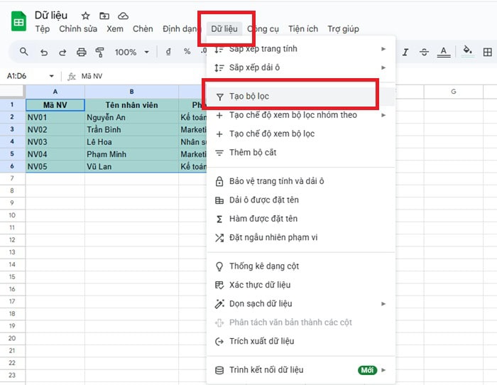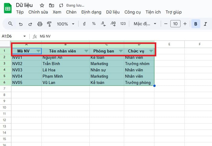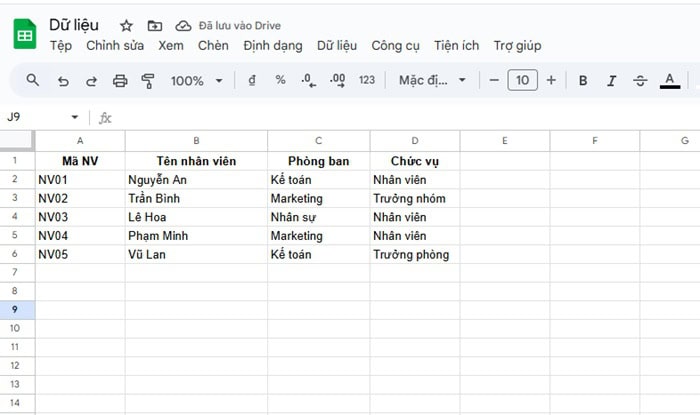 Giả sử bạn có một bảng dữ liệu quản lý nhân viên trong Google Sheets như sau: