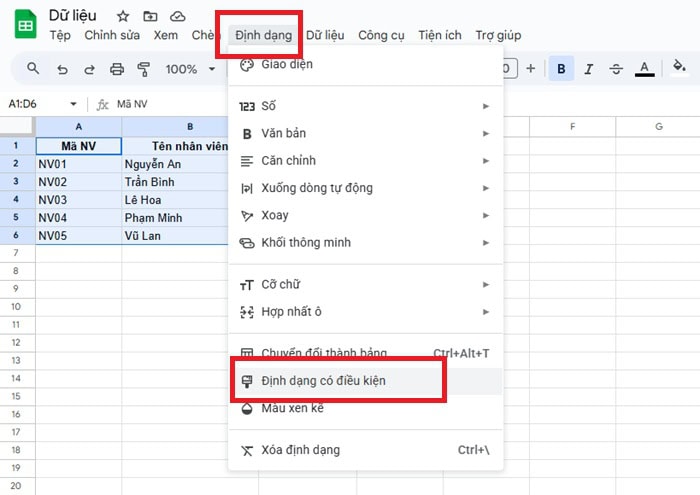 – Bước 2: Trên thanh menu, bạn hãy chọn Định dạng (Format) >> chọn Định dạng có điều kiện (Conditional formatting)