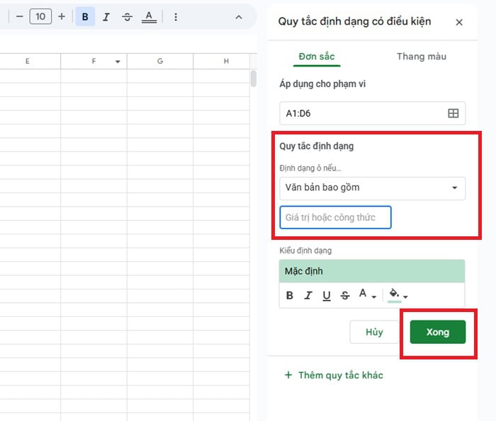 – Bước 3: Tại mục Định dạng ô nếu, bạn hãy chọn Văn bản chứa (Text contains) và nhập từ khóa bạn muốn tìm. Đồng thời, bạn hãy chọn màu tô để làm nổi bật dữ liệu.