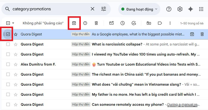 – Bước 1: Đầu tiên, bạn mở Gmail và chọn vào một email cụ thể hoặc chọn nhiều email bằng cách đánh dấu vào ô vuông bên cạnh mỗi email.