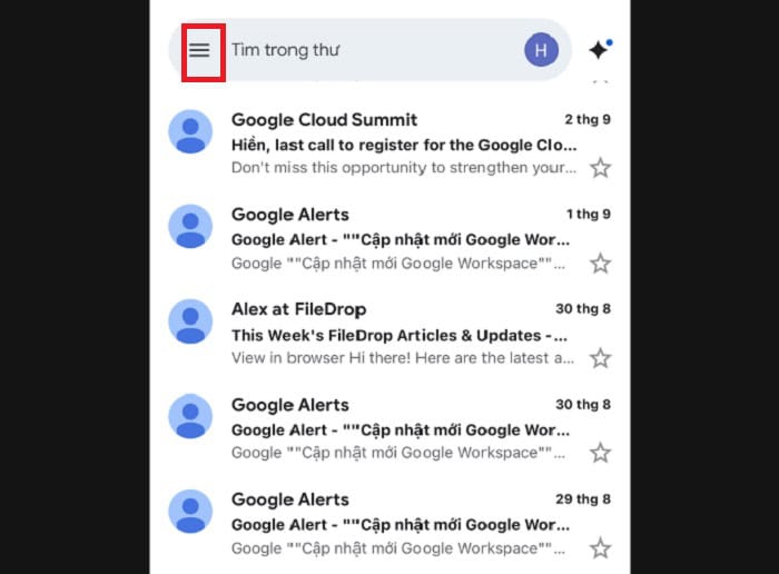 – Bước 1: Đầu tiên, bạn cần mở ứng dụng Gmail và chạm vào biểu tượng menu ba gạch ngang (☰) ở góc trên cùng bên trái.