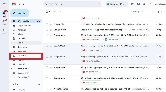 – Bước 3: Bạn muốn tìm thư lưu trữ Gmail ở đâu thì hãy nhấp vào nhãn Tất cả thư. Bây giờ, bạn sẽ thấy tất cả các email trong tài khoản của mình, được sắp xếp theo thời gian nhận, bao gồm cả những email đã lưu trữ.