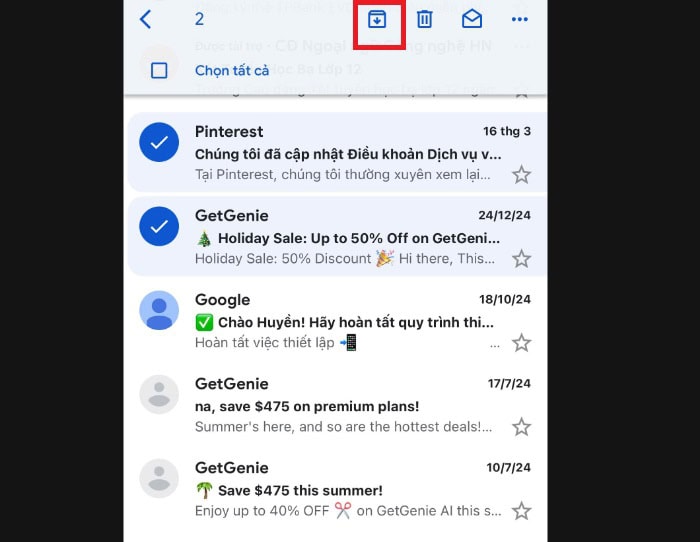 - Đối với nhiều email: Chạm và giữ vào email đầu tiên để chọn, sau đó chạm vào các email khác để chọn thêm. Cuối cùng, chạm vào biểu tượng Lưu trữ ở trên cùng.