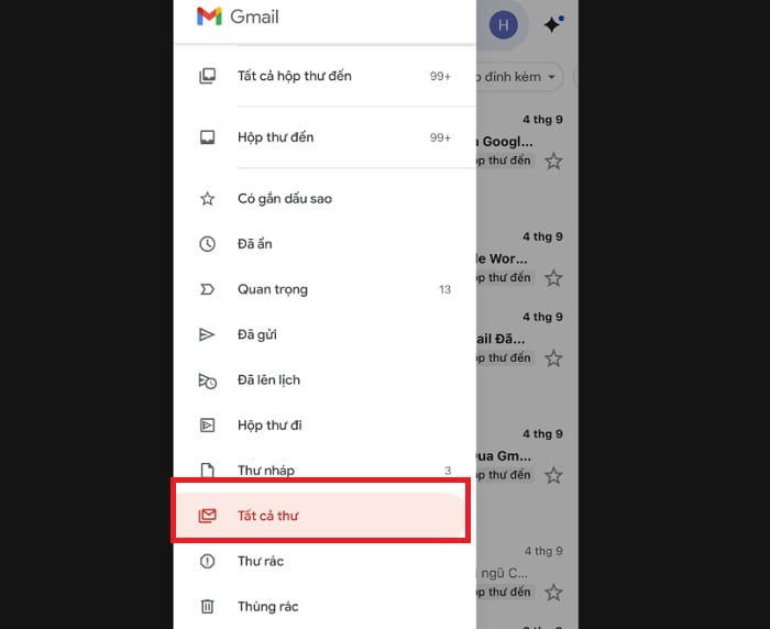 – Bước 2: Một menu sẽ trượt ra từ bên trái, bạn hãy cuộn xuống và tìm nhãn Tất cả thư.