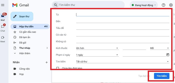 – Bước 3: Sau khi điền đầy đủ thông tin, bạn có thể thêm cú pháp -in:inbox vào trường Từ khóa hoặc kết hợp các trường khác nhau để tìm kiếm. Cuối cùng, bạn nhấp vào nút Tìm kiếm ở cuối cửa sổ.