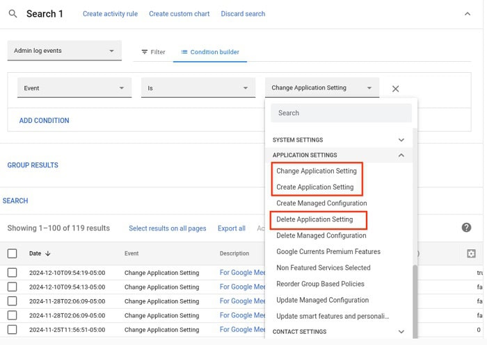 - Các thay đổi sẽ được phân loại thành các sự kiện mới, bao gồm Thay đổi cài đặt ứng dụng, tạo cài đặt ứng dụng và xóa cài đặt ứng dụng.