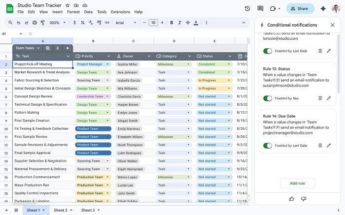 Tính năng này cho phép người dùng tạo các quy tắc tự động gửi email thông báo khi dữ liệu trong Sheets đáp ứng tiêu chí nhất định. Ví dụ: trạng thái công việc thay đổi, người được giao việc được thêm vào.