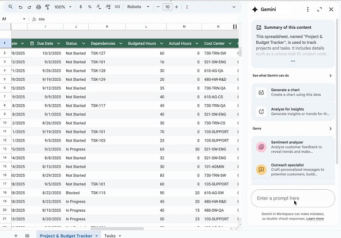 Gemini trong Google Trang tính