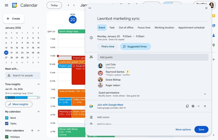 Việc sắp xếp một cuộc họp có sự tham gia của nhiều thành viên, đặc biệt là các nhóm làm việc từ xa ở các múi giờ khác nhau, vốn là thách thức tốn nhiều thời gian. Giờ đây, Gemini trong Google Calendar đã đơn giản hóa quy trình này bằng tính năng gợi ý thời gian thông minh. Thay vì phải kiểm tra thủ công lịch trình của từng người, bạn chỉ cần nhấn vào mục “Gợi ý thời gian” (Suggested times) khi tạo hoặc chỉnh sửa sự kiện.