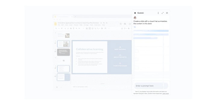 - Gemini trong Slides: Tự động tạo hình ảnh gốc và thiết kế các trang trình bày sinh động từ mô tả văn bản, giúp bài giảng trở nên trực quan hơn.