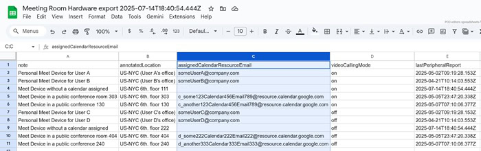 - Để hủy gán lịch: Chỉ cần để trống ô assignedCalendarResourceEmail trong hàng của thiết bị đó.