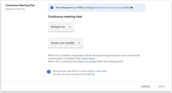 Tùy vào cấu hình của Admin, bạn có thể bật/tắt tính năng trò chuyện liên tục trong phần tùy chọn cuộc họp trên Google Calendar trước khi bắt đầu. Nếu Admin đã khóa cài đặt, tùy chọn này sẽ không hiển thị. Để tính năng này hoạt động, Google Chat phải được bật sẵn trong tổ chức của bạn.