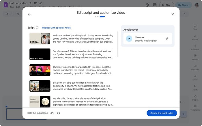 Cụ thể, khi nhập file Slides vào Google Vids và bật Gemini, hệ thống sẽ tự động tạo kịch bản cho từng slide. Điểm mới là người dùng có thể xem trước và chỉnh sửa nội dung này ngay lập tức trước khi tạo video hoàn chỉnh. Bạn cũng có thể lựa chọn sử dụng ghi chú thuyết trình sẵn có thay vì nội dung AI đề xuất, giúp đảm bảo thông điệp truyền tải đúng với mục tiêu ban đầu.