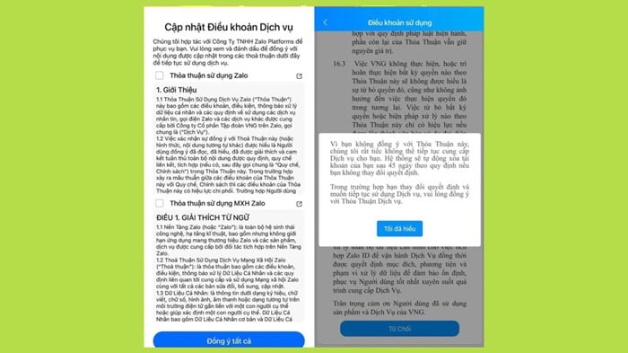 Zalo triển khai trực tiếp việc cập nhật chính sách trong ứng dụng. Điều này tạo cho người dùng cảm giác bị ép buộc chấp nhận điều khoản dịch vụ mới thay vì có quyền lựa chọn linh hoạt.