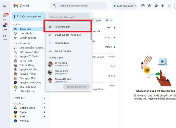 – Bước 3: Trong Google Chat, bạn sẽ thấy mục Cuộc trò chuyện mới >> nhấn vào dấu cộng (+) và chọn Tạo không gian.